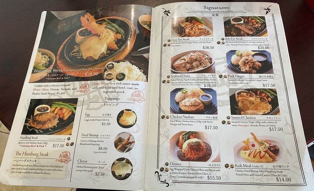 FOOD ALLERGY WARNING: Shellfish, Wheat, Egg Japanese Salisbury Steak (g) with pieces of Shrimp and Melted Monterey Cheese on top of the patty. Comes with Rice, Miso/Corn Soup, and Small Salad