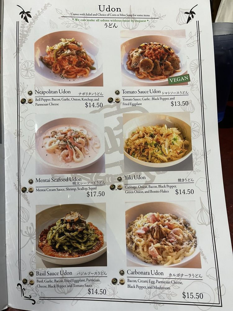 FOOD ALLERGY WARNING: Shellfish, Wheat Mentai Cream Sauce, Shrimp, Scallop, and Squid. Comes with Miso/Corn Soup, and Small Salad