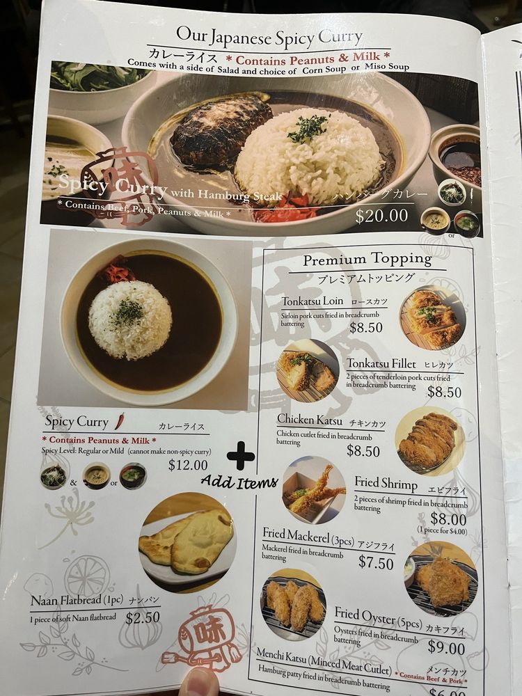 FOOD ALLERGY WARNING: Peanuts, Dairy Curry Rice with Hamburg Steak (g). Comes with Miso/Corn Soup, and Small Salad