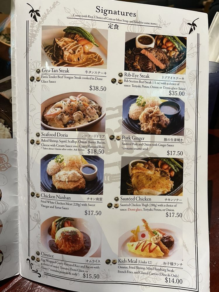 Extra tender beef tongue steak cooked in demi-glace sauce. Comes with Rice, Miso/Corn Soup, and Small Salad