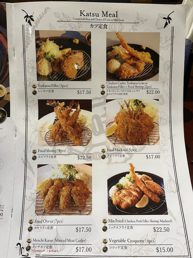 CONTAINS SEAFOOD Chicken, Pork Fillet, Shrimp, Mackerel Katsus Comes with Rice, Miso/Corn Soup, and Small Salad